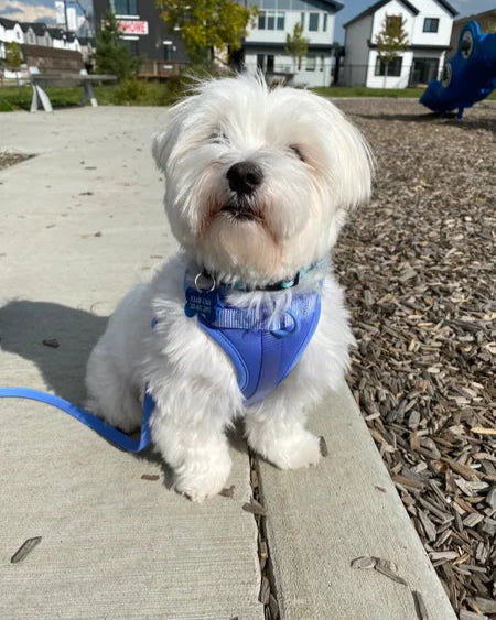 Żaden materiał tekstylny nie jest „gryzoodporny”; taśmy MellowTrail™ są odporne na ciągnięcie, nie na żucie. Wprowadź zasadę: sprzęt jest do spaceru, gryzaki są do żucia (zamiana w momencie sięgania po taśmę). Po powrocie odpinasz zestaw i odkładasz poza zasięg zębów. Gdy problem trwa, zaproś trenera do przećwiczenia kontrolowanych przystanków i przekierowań zachowania.